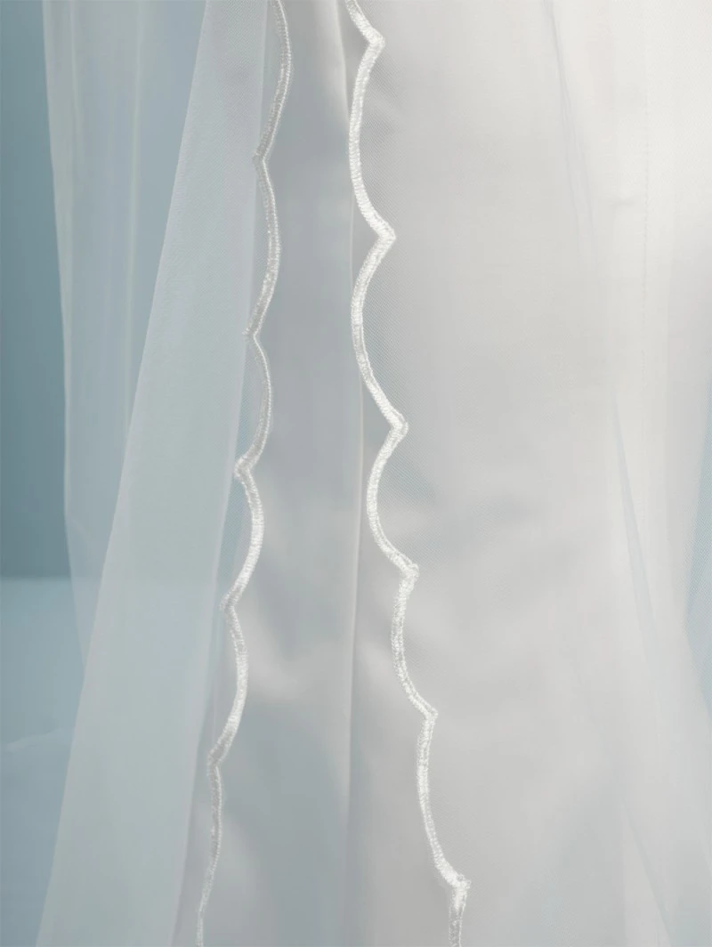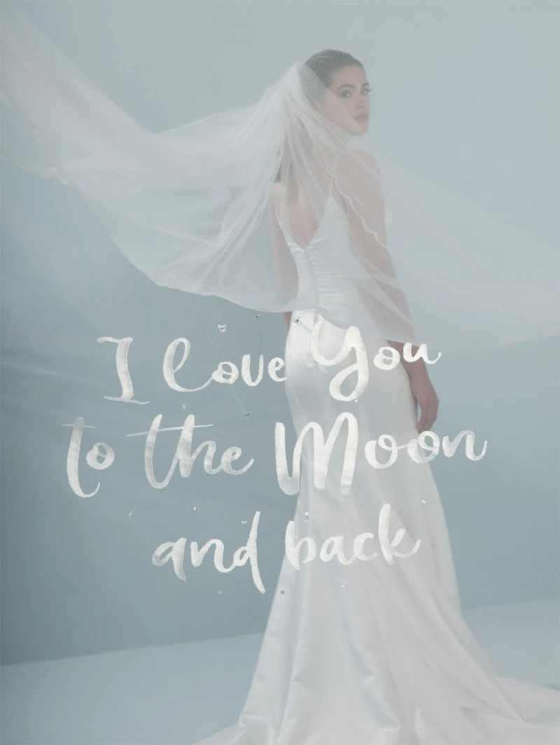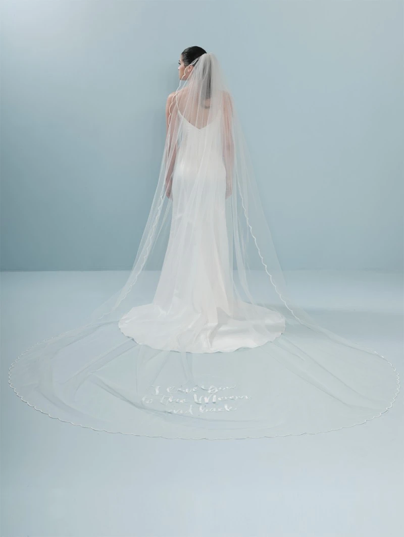 Details: ivoorkleurige tule sluier met geborduurde randen in golfpatroon en een geborduurde tekst “I love you to the moon and back”.